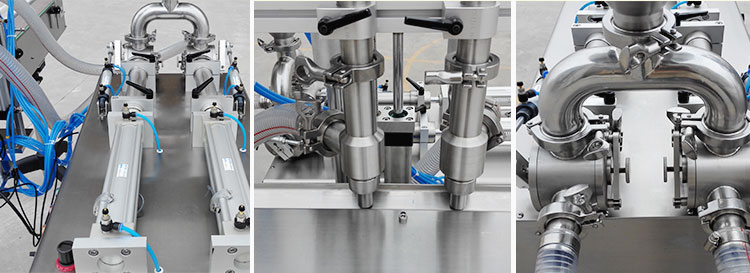 星火包裝機械之一 雙頭直線式醬料灌裝機,專用于大顆粒的醬料灌裝,解決了以前辣椒醬廠家需要大量人力才能完成灌裝的難題,并且提高了產品的灌裝精度。該機和物料接觸部位全部采用316L高級不銹鋼制成,動力使用臺灣亞德客氣缸推動,整機干凈大方、動力強勁,使很多客戶順利解決了ISO2000和QS認證。下圖為機器部件大圖展示:
