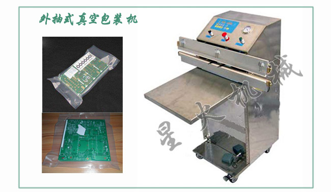 外抽式真空包裝機通過抽氣嘴放到被包裝物的包裝袋內,抽空空氣,退出抽氣嘴,然后完成封口。外抽真空機具有對包裝袋進行自動定型,抽真空的功能,以達到防止電子元件氧化的效果